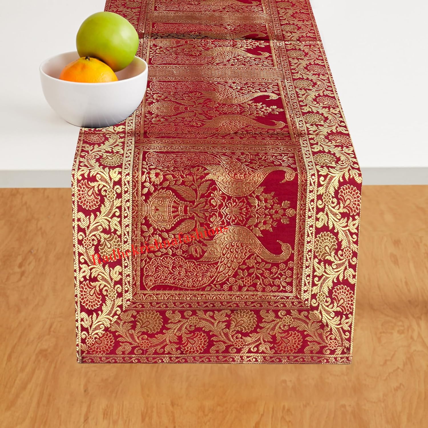 you’re looking for something a little more sophisticated for your dining area, this gorgeous shimmering table runner will certainly meet your needs. Bright, bold fabric colors are surrounded by a golden Saree border that is exclusive to Banarsi Designs